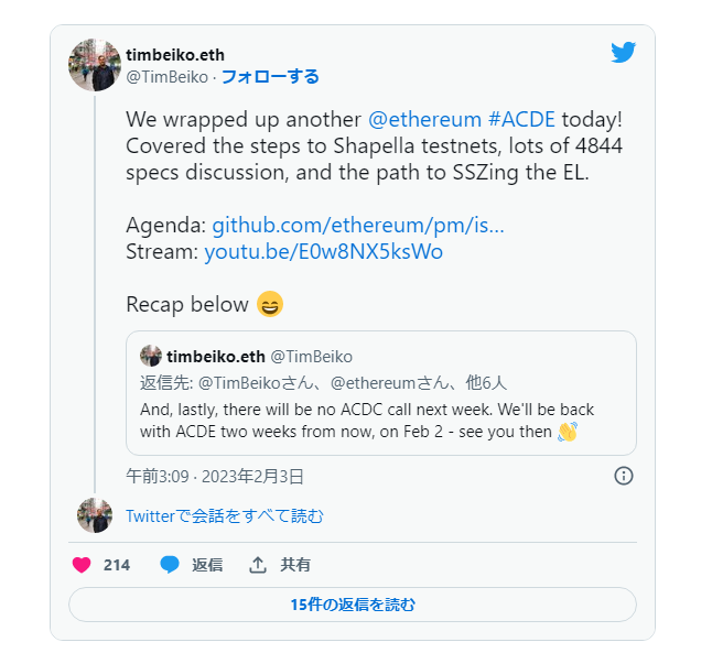 複数のテストネットでの起動が全て成功した場合、メインネットでの上海アップグレードは、最短で3月中旬までに実施可能になるとの見解も出ている。