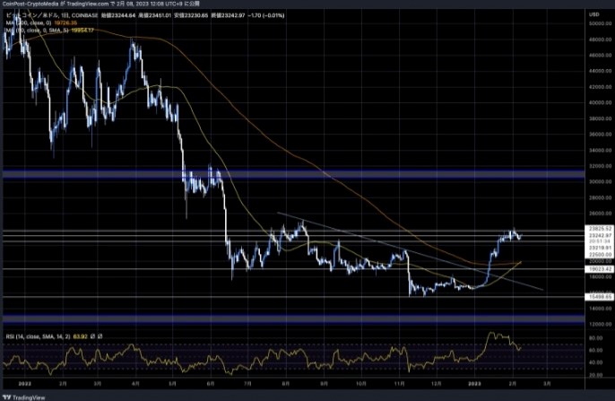 暗号資産(仮想通貨)市場では、ビットコインは前日比1.63%高の23,240ドルに。