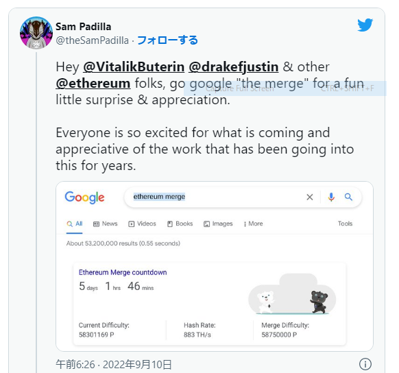 Google Cloudのブロックチェーン開発者であるSam Padilla氏は9日、英語版のGoogle検索で「the merge」と入力すると、The Merge(ザ・マージ)に向けたカントダウン機能が追加されたことを発表した。