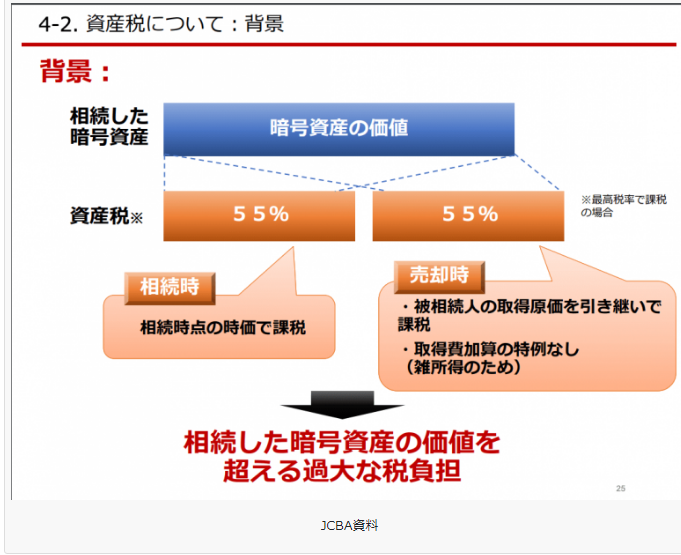 その場合、雑所得のために取得費加算の特例は適用できず、相続時と売却時の二段階の課税により「相続暗号資産価値を超える過大な納税額負担(最大110%)が生まれるケースがある」という。