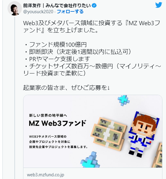 2022年5月27日、著名な実業家である前澤友作氏が、TwitterでWeb3特化型のファンド『MZ Web3ファンド』の設立をアナウンスしました。