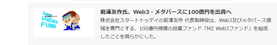 過去に「社会課題の解決・趣味の追求」を目指す起業家へ出資する『前澤ファンド』を立ち上げて多数の企業に出資してきた同氏が、Web3市場への投資を本格化した形です。
