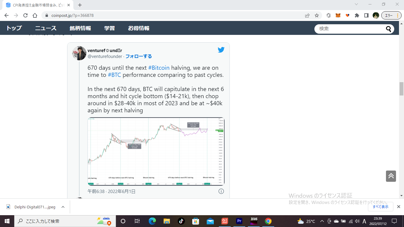 1.CPI発表控え金融市場弱含み、ビットコイン続落で2万ドル水準割り込む