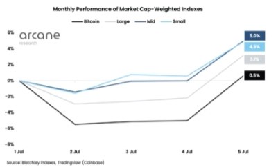 7月第1週の騰落率では、スモールキャップ(低時価総額)インデックスが+4.9%、ミドルキャップが+5.0%の上昇を見せた。これは主要アルトを示すラージキャップの3.1%、基軸通貨ビットコインの0.5%を大きく上回る水準だ。