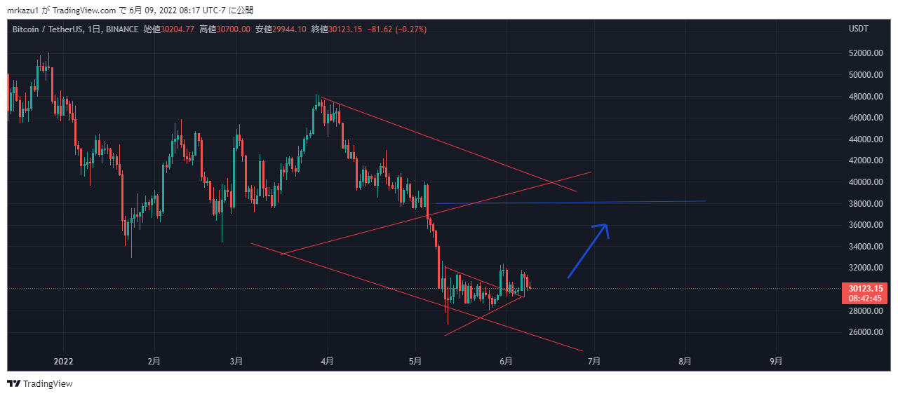 本日のBTCは三角持ち合いを裏タッチして抜けています、現物買いのチャンスです。 |