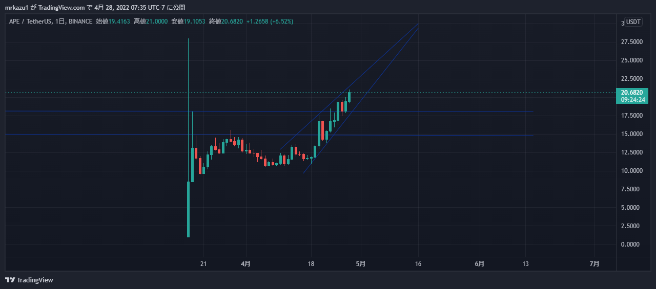 BTCは下落トレンドを下回ったけど、少し様子見をしてショートに入った方が良いでしょう。 まだ仮想通貨バブル崩壊では無いです。 APE相場分析 APEは待望の100ドル達成には時間が掛かるでしょう。 【重要】爆益期待の仮想通貨 APEX は、分散型取引所(DEX) のAPEX Exchangeのトークンで、NFTゲームも発表予定。すでにゲームに使う NFT は発行済み