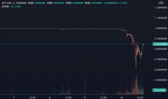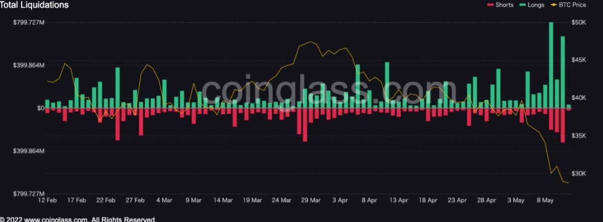 大幅続落の背景としては、ナスダックなど米主要株価指数の大幅下落に伴うセンチメントの悪化と、Terraform Labsが発行するアルゴリズム(無担保)型ステーブルコインの「UST(TerraUSD)」の影響が挙げられる。ステーブルコインの役割として機能すべき米ドルと1:1の価値を外れ(depeg)、USTが激しく乱高下したことが市場の動揺を誘った。 ステーブルコインとして第3位の規模にまで成長したUSTと価格維持アルゴリズムの仕組み上密接な関係にあるLUNAはデススパイラルに陥り、下落に歯止めが掛からず暴落。前日比-96.5%、前週比-99.2%に達した。 TerraformLabs(TFL)開発の主要レンディングプロトコル「Anchor Protocol」など、DeFi(分散型金融)市場における信用不安も市場心理の悪化に拍車をかけた。
