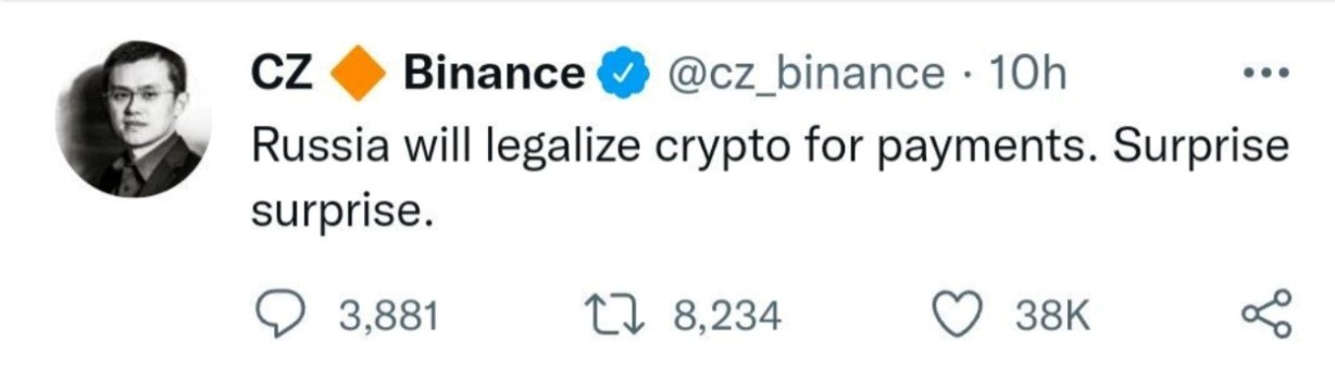 ただ、この情報は、すぐに未確定情報であることがわかり、CZや他のユーザーもロシアでの仮想通貨の合法化に関するツイートを削除している。