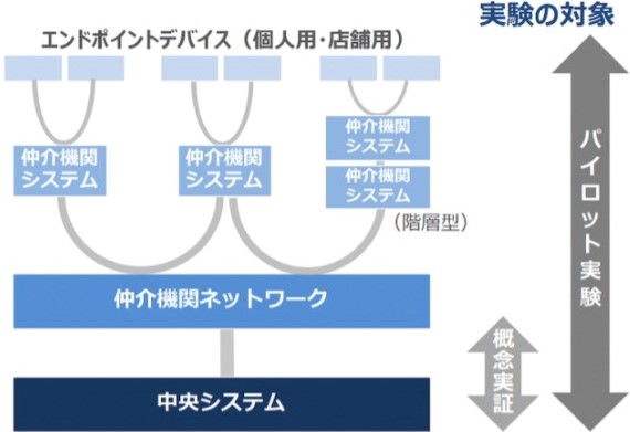 具体的には、中央システムから、仲介機関ネットワークや仲介機関システム、エンドポイントデバイスまでを一体的に実装するものとして実験用のシステムを構築。これまでの概念実証の構築対象は、基本的に中央システムだけだった。