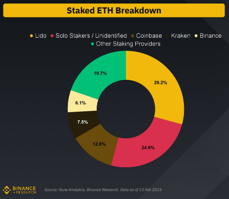 その次に、大手取引所米コインベースやバイナンス、クラーケンが合わせて26%の市場シェア、さらに個人でステーキングを行っている者が25%と続く。