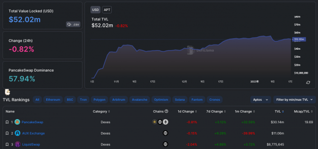 なお、BNB Chain基盤の主要DEX(分散型取引所)PancakeSwapでは、Aptosブロックチェーン上のTotal Value Locked(TVL)が60%弱に達した。