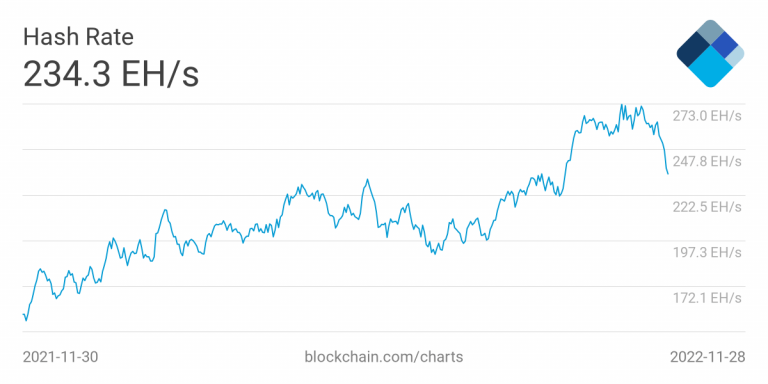 2022年以降の弱気トレンドでも上昇し続けていたハッシュレートも一転して下落に転じ始めた。 Diamond Handsの「2022 ビットコインマイニングアップデート」調査レポートによれば、ハッシュレートおよび採掘難易度の遅行的な上昇は、サプライチェーン(供給網)の乱れや半導体不足などの影響から、最新鋭の採掘マシン納品がずれ込んだ影響が大きかった。
