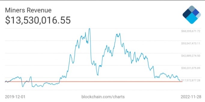 マイナー収益(Revenue)は、2年ぶりの低水準まで下落。