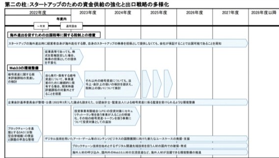 11月28日に総理大臣官邸で第13回新しい資本主義実現会議が開催され、「スタートアップ育成5か年計画」の内容が決定した。ブロックチェーン技術とWeb3.0(分散型ウェブ)の税制を含む環境整備が含まれている。