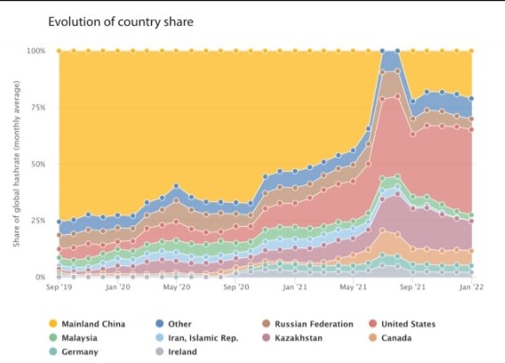 10位中国の中央政府は仮想通貨を全面的に禁止しているが。ケンブリッジ大学の統計では現在も中国はビットコイン(BTC)ネットワークにおける採掘シェア(ハッシュレート)で2位に位置していた。