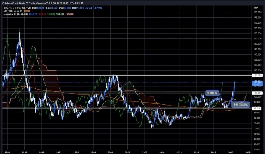 主要国通貨に対する米ドルの強さを示す「米ドル指数(DXY)」は、10月20日時点で112.89を付けた。