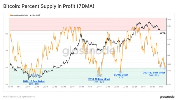過去の歴史では、2014〜2015年の弱気相場で40〜41%、第1次仮想通貨バブル崩壊後の2018〜2019年で41〜42%、2020年3月のコロナ・ショックでは47%に達し、いずれも大底を形成。その後、相場は反転上昇した。