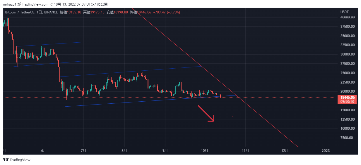 BTCの年初来安値17,500ドルが迫る中、米株指数上昇を背景に反発した。長い下髭のピンバーを付けており、上値抵抗線のトレンドラインをブレイクできるかの局面にある。ただしマクロ経済の状況からすれば翌年にかけて地合い悪化の長期化は避けられない見通しで、この先の展開が問われる。