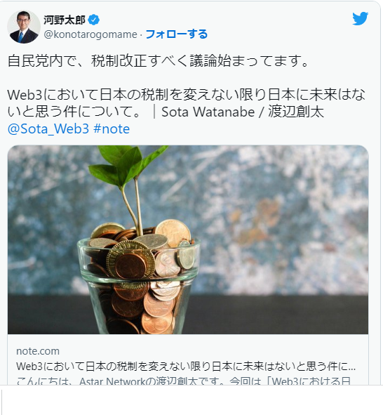 河野大臣は今年2月、⽇本発のパブリックブロックチェーンであるAstar Network 渡辺創太CEOの「Web3における日本の税制」をテーマにした見解を取り上げ、「自民党内で税制改正すべく、すでに議論が始まっている」と述べるなど、現状への理解と前向きな姿勢を示していた。