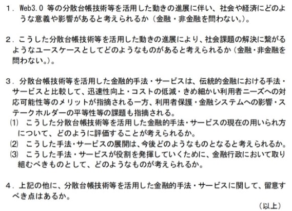 事前公開された討議事項で金融庁は「価値が1つの企業に独占されないといったメリットがあるとの指摘がある一方で、実際は中央集権的であるとの指摘や投機的金融要素と切り離せないといった指摘もなされている」と言及。参加者に以下4つの質問を投げかけている。