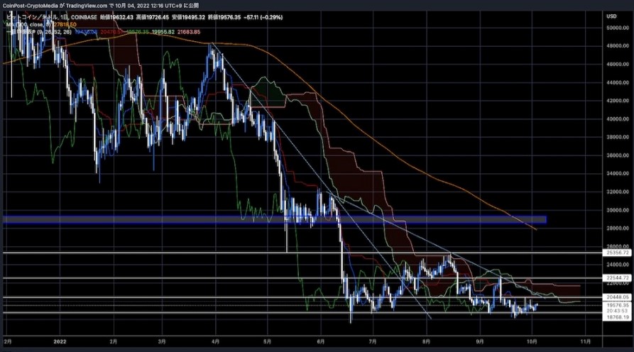 暗号資産(仮想通貨)市場では、ビットコインは前日比2.2%高の19,590ドルで推移する。