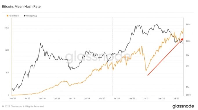 この点について、Isaiah(@BitcoinIsaiah)氏は、BTC価格が1年間で72%下落したにもかかわらず、ハッシュレートは同期間で84%上昇したと指摘した。