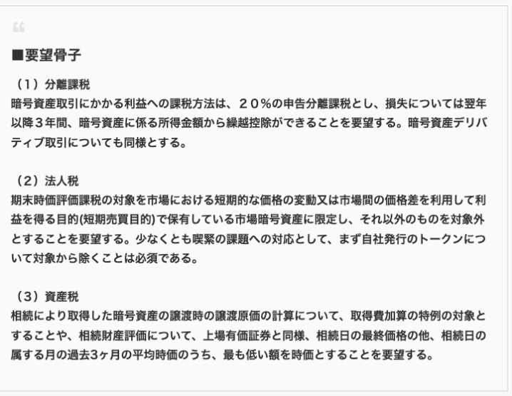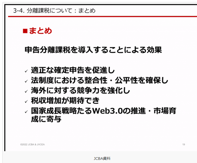その上で、「日本政府がWeb3.0を国家戦略するのであれば、必然と国民が暗号資産に触れる頻度が飛躍的に高まることになる。」「逆に言えば、表裏一体の暗号資産が平易に持ちやすくすることは、Web3.0の普及につながり、市場の育成に寄与することになる。」として、税制改正のメリットを強調した。