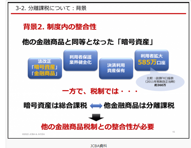 2. 制度内の整合性が取れていない また、「暗号資産はさまざまな法改正の中で、伝統金融商品に近いレベルの厳しい規制やコンプライアンスなどが求められ、業界健全化が進んでいるが、その一方で暗号資産の場合は税制のみ他の金融商品とは異なり総合課税となっているのは、制度内の整合性が取れていない。」として、租税の中立性の観点から矛盾点を指摘した。