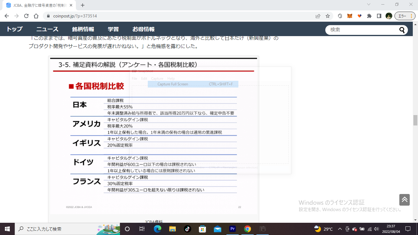 さらに海外の先進主要国の例では、「米国や英国などは金融商品と同等の暗号資産はキャピタルゲイン課税(分離課税20%)になっており、比較すると税制において日本は見劣りしていると言わざるを得ない。」と言及。