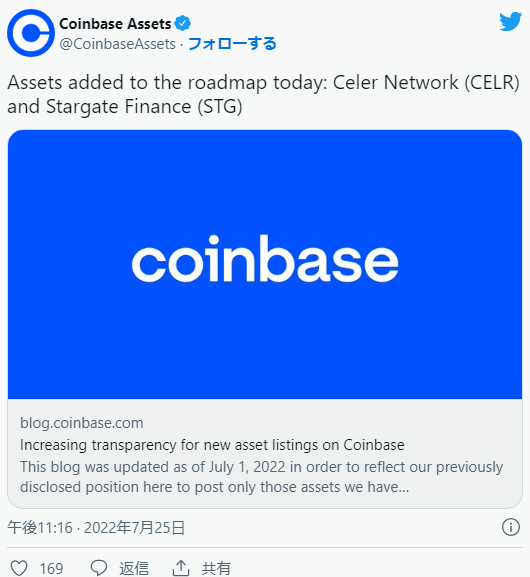 また、コインベースはCeler Network(CELR)とStargate Finance (STG)の上場方針も発表。後日の上場実施になる予定だ。