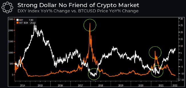 arca blogによれば、インフレの先行指標(コモディティ、自動車価格、住宅購入者など)はすべてが弱さの兆候を示す。リスクオフ局面で米ドルが買われる中、ドル指数の強さも相場の重石に。