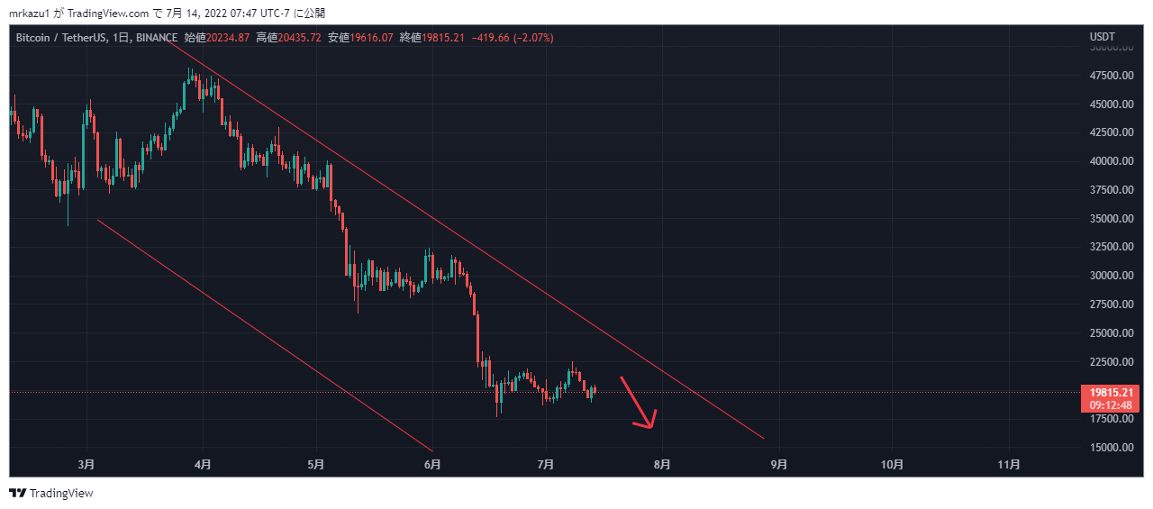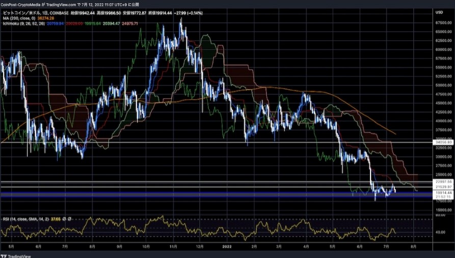 ビットコイン(BTC)相場は8日までに反発していたが、22,000〜23,000ドルのレジスタンスライン(上値抵抗線)を抜けられず。三角保ち合いを下放れると売りが再加速、4日間足らずで2,000ドル以上下落した。1日の安値18,600ドルに接近しつつあり、最安値17,560ドルが意識される展開を迎えている。