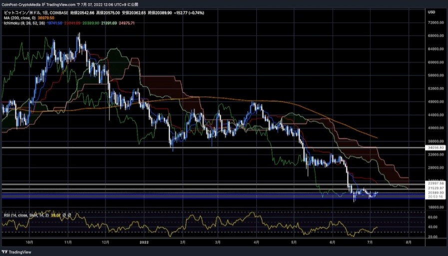 21,800ドル〜18,600ドルのレンジ内で揉み合いが続いている。