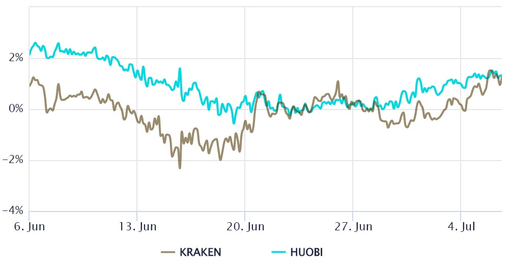 デリバティブ(金融派生商品)市場では、ビットコイン(四半期)先物のプレミアムについて、現物価格差がマイナス乖離のバックワーデーションからコンタンゴに回帰した。相場の不確実性に対する懸念後退が背景にあるものと見られ、市場が健全化した場合、年率5〜10%程度で落ち着く傾向にある。