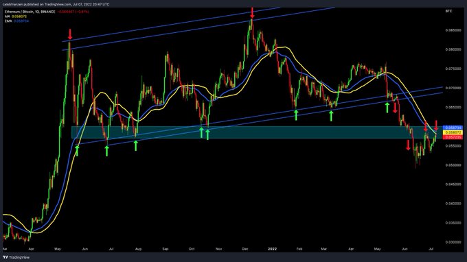 Caleb Franzen(@CalebFranzen)氏は、ビットコイン建の「ETH/BTC」にて、200日移動平均線のリテストをクリアした場合、重要なリスク選好シグナルとなり得るとの見方を示した。 Will Clemente(@WClementeIII)氏も、反転するにせよ下落継続するにせよ、相場のターニングポイントだとしている。