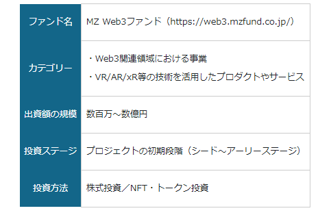MZ Web3ファンドの投資対象となるのは、「Web3関連領域における事業を行う企業や団体」「VR/AR/xR等の技術を活用したプロダクトやサービスを提供する企業」の2カテゴリ。
