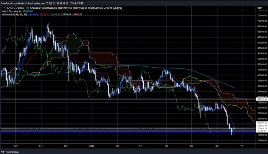 一時21,700ドル台まで上昇したが反発ペースを早めていたこともあり、23,000ドルのレジスタンスライン(上値抵抗線)を前に米国時間では利益確定売りが優勢となった。リスクオフ局面では米株指数に連動しつつ、今後2万ドルの節目を跨いだ攻防が激しくなる可能性がある。