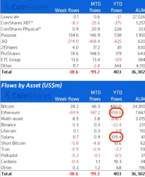 11週間連続の流出超過となり、2022年以降、累計4億5900万ドルが流出した。一方ソラナ(SOL)は先週70万ドル、現在までに1億900万ドルの資金流入に至った。