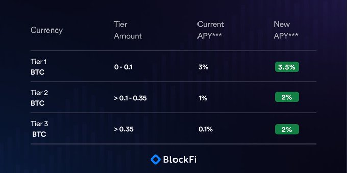 BlockFiは24日、有利子口座サービスでビットコイン(BTC)やイーサリアム(ETH)、USDC、USDTなど7銘柄の利率を7月1日から上げることを発表している。