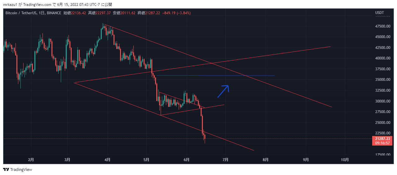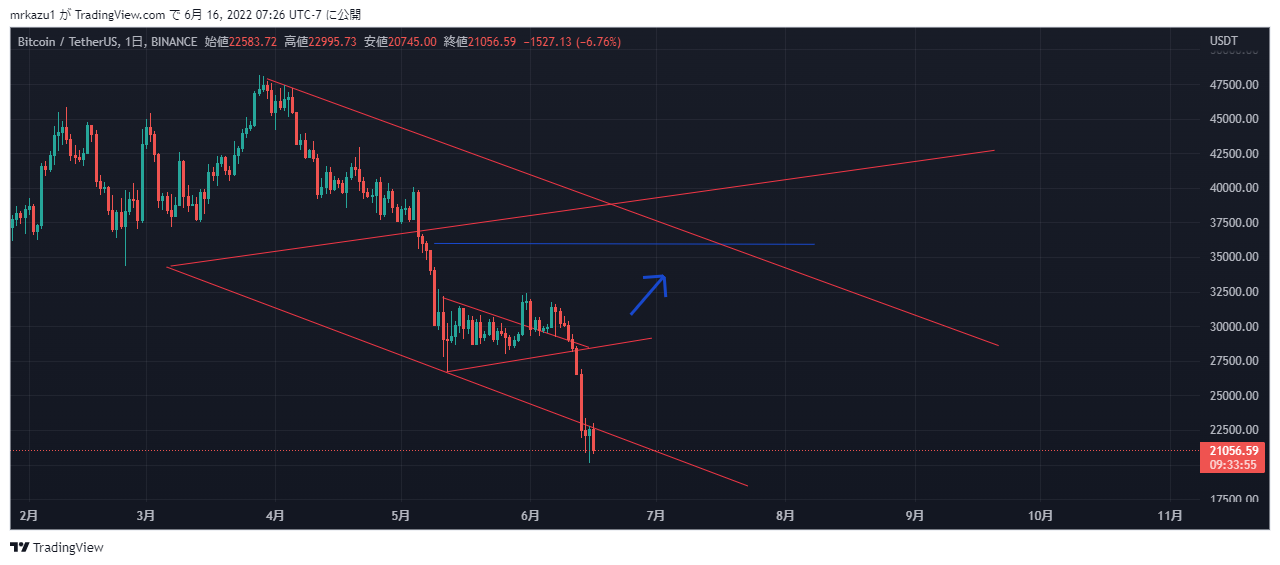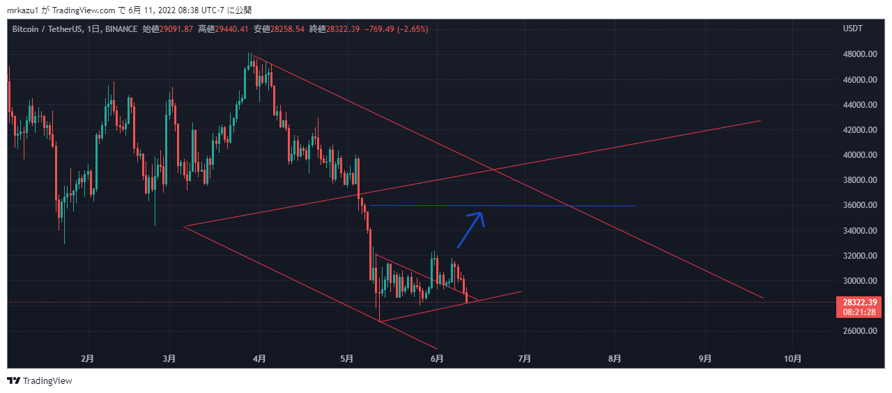BTCは斜めのサポートがきいています、ここまで来ればズドン落ちて来る可能性も有ります、ショートはしなく下がれば現物買っていっています。 |