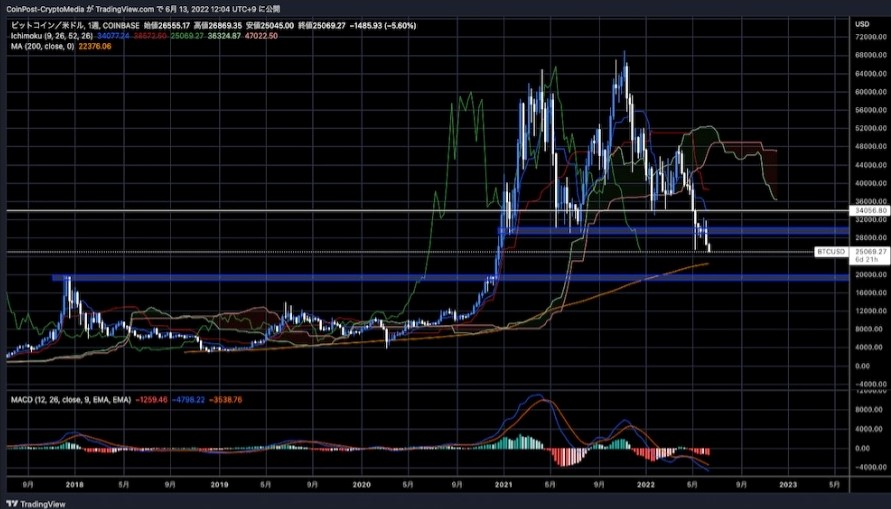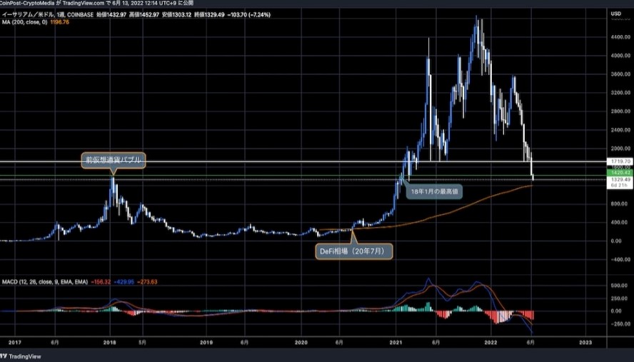 21年5月の暴落時に持ち堪えた1700ドルのサポートライン(下値支持線)を割り込み、下落が加速した。