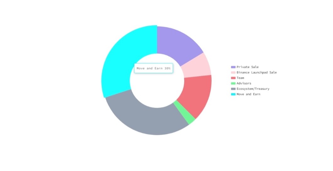 GMTトークンの配布分布は、以下の通りです。 エコシステムファンド(トレジャリー)に発行量の30%、プライベートセール参加者に16.3%、バイナンスLaunchpadセール参加者に7%、開発チームに14.2%、アドバイザーに2.5%が配布されます。