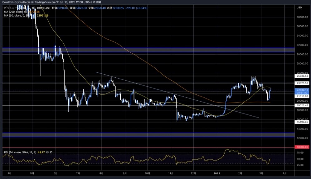 暗号資産(仮想通貨)市場では、ビットコインは前日比8.79%高の22,330ドルと大きく反発した。
