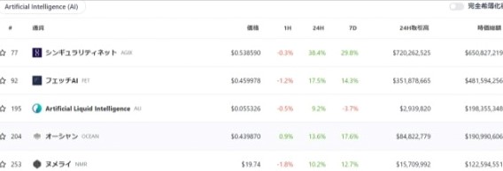 暗号資産(仮想通貨)市場では、人工知能(AI)関連銘柄が物色され、15日の取引で全面高の様相を呈している。