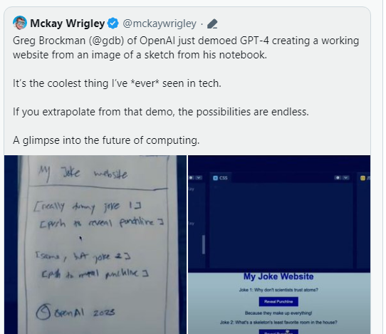 マルチモーダルモデルは、対話システム、テキスト要約、機械翻訳など、幅広い用途での利用が想定される。OpenAIのグレッグ・ブロックマン共同創設者によるデモンストレーションでは、ウェブサイトの手書きイラストをベースに、実際のウェブサイトを作成できることが示された。