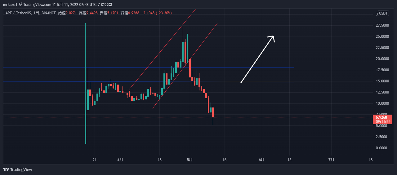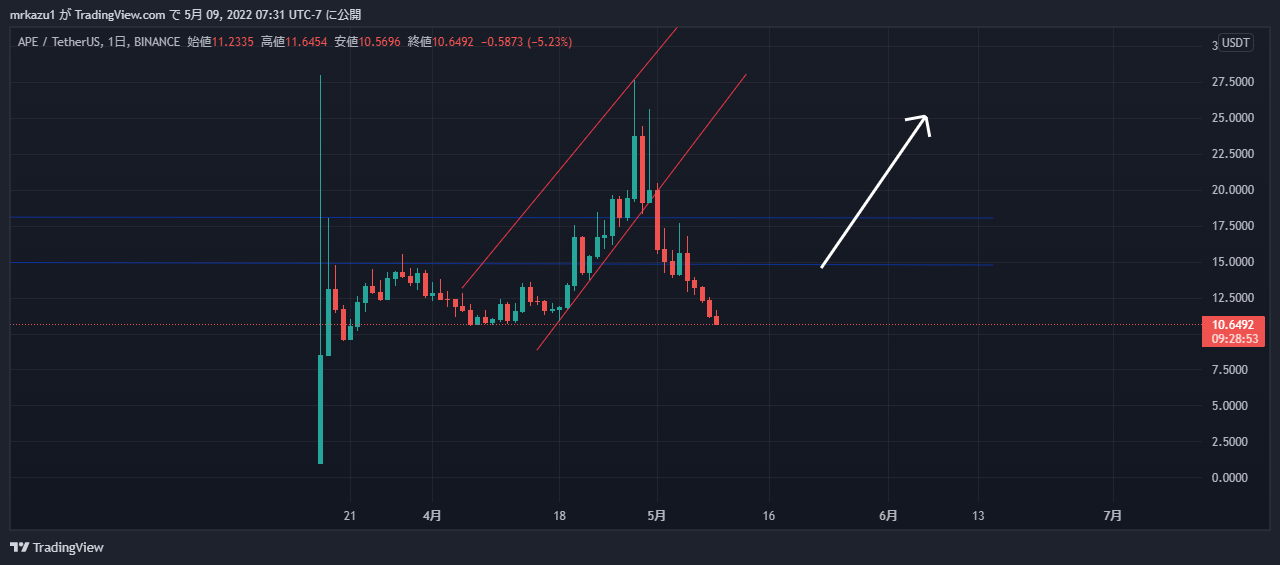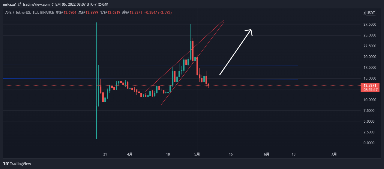 BTCは下落トレンドを下回ったけど、少し様子見をしてショートに入った方が良いでしょう。 まだ仮想通貨バブル崩壊では無いです。 APE相場分析 APEは待望の100ドル達成には時間が掛かるでしょう。 【重要】爆益期待の仮想通貨 APEX は、分散型取引所(DEX) のAPEX Exchangeのトークンで、NFTゲームも発表予定。すでにゲームに使う NFT は発行済み