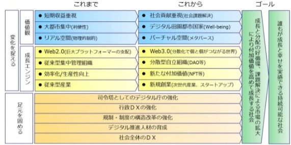 デジタル社会推進本部は、今回発表した「デジタル・ニッポン 2022」を「岸田内閣が目指す『新しい資本主義』に対して、デジタルの側面からアプローチし、必要な施策を提言するもの」として位置づけており、「成長と分配の好循環、課題解決による市場の拡大により付加価値を高めて成長する社会」と「誰もが成長と幸せを実感できる持続可能な社会」を実現するための提言をする。