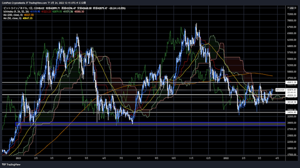 24日の暗号資産(仮想通貨)市場では、ビットコイン価格は前日比+1.7%の520万円(42,940ドル)。株式市場との相関は限定的で下値を切り上げつつある。