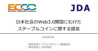 一般社団法人DeFi協会(JDA)と一般社団法人ブロックチェーン推進協会(BCCC)は25日、共同提言として「日本社会のWeb3.0開国にむけたステーブルコインに関する提言」を公表した。