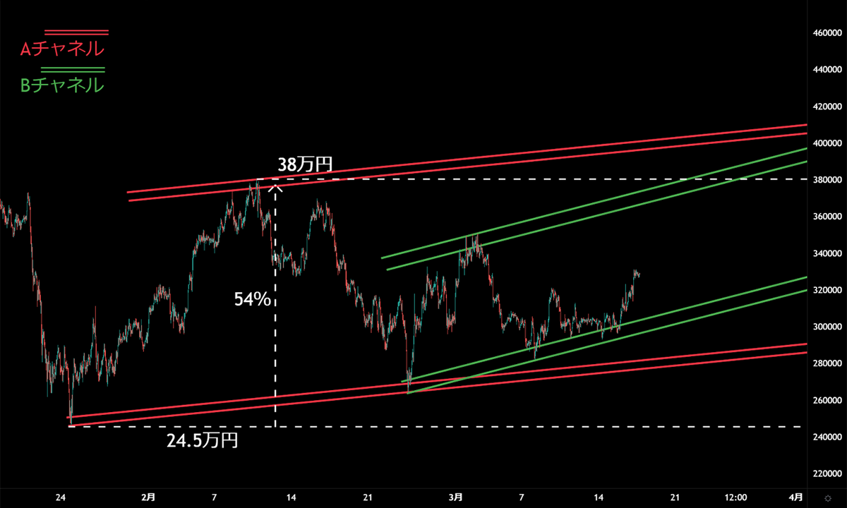 ・Aチャネル(1/24の安値:24.5万円と2/10の高値:38.0万円を起点として引いたチャネルライン)